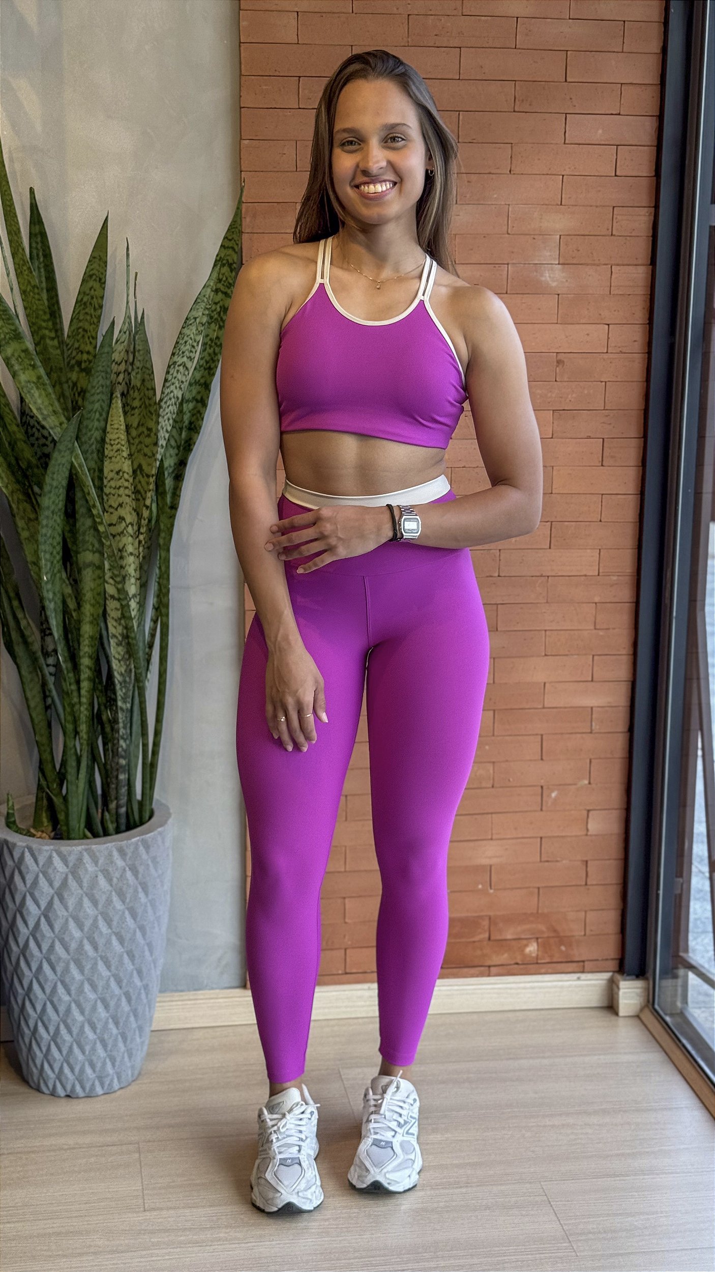O Conjunto Fitness Essence é para quem gosta de peças estilosas e elegantes. Foi produzido com tecido em poliamida e elastano que tem um toque muito macio, e excelente compressão. Possui tecnologia AIR que tem ótima respirabilidade e deixa a peça com muito conforto térmico. A Legging lisa possui detalhe no cós, possui também cós alto anatômico. O Top liso possui alças duplas em viés que vão para trás formando um X, possui também bojo removível.